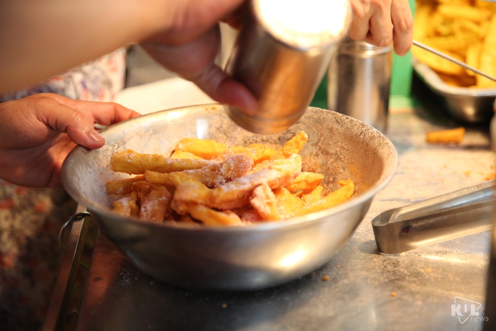 Những miếng khoai vàng ươm, nóng hổi không được ăn ngay mà cho vào hộp hoặc dụng cụ chuyên dụng, thêm chút bột phô mai hoặc bột xí muội (tùy ý thực khách), lắc đều cho bột phủ hết miếng khoai rồi lấy ra thưởng thức. Một phần khoai lang như vậy được bán với giá từ 10.000 – 20.000 đồng, tương đối rẻ so với thu nhập của người bình dân.